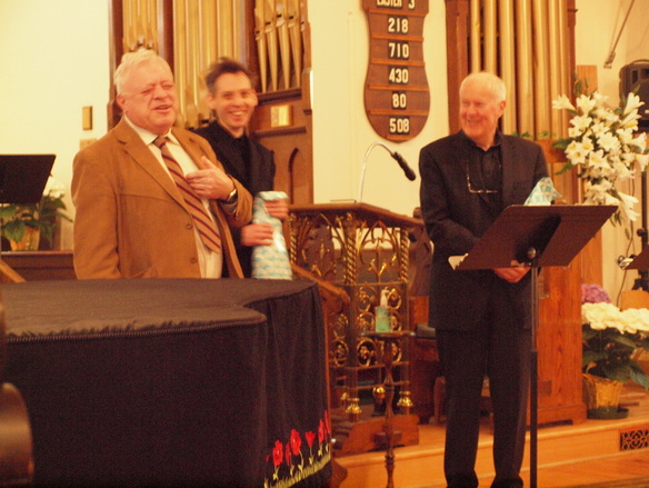 Rob Tite (Clarinet) and David Palmer tease Richard Smith, following Christ Church, Markdale ON recital, April 2013