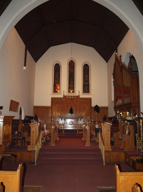 Interior of Christ Anglican Church, Listowel ON, site of the 2013 Good Friday “Harmonies” service, showing 1898 Lye tracker in its chancel location