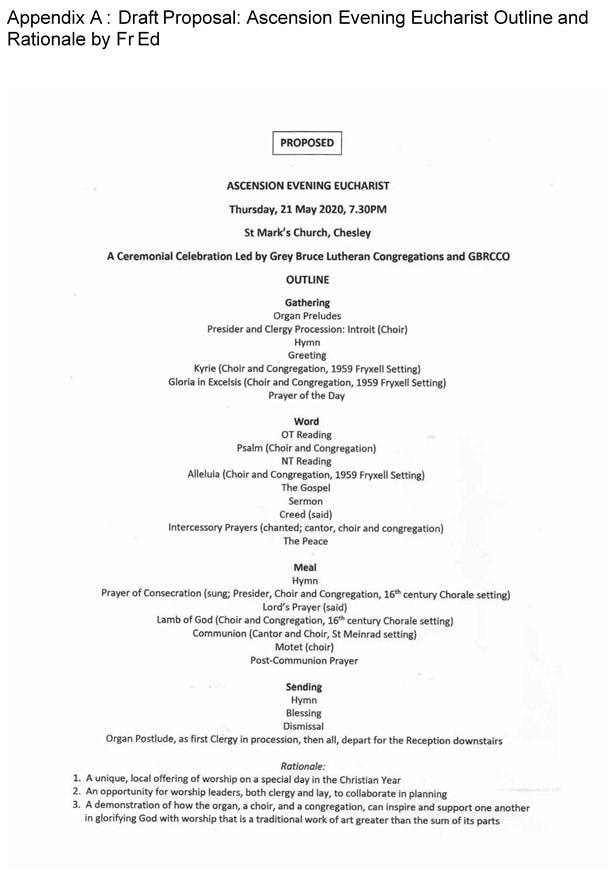 Fr Ed brought the outline of the service (Appendix A), emphasizing that the use of organ is liturgically proper and that 1959 Fryxell (beloved) Setting is used (basic outline of which is gathering-word-meal-something that Lutherans do every Sunday in this area) and also16th century Choral setting is used for communion. In this proposed service, choir (to lead congregational singing) and cantor are required. As for the space, St. Mark’s, Chesley, is large enough to accommodate the planned service. Members unanimously agreed to support Fr Ed to prepare finer details.