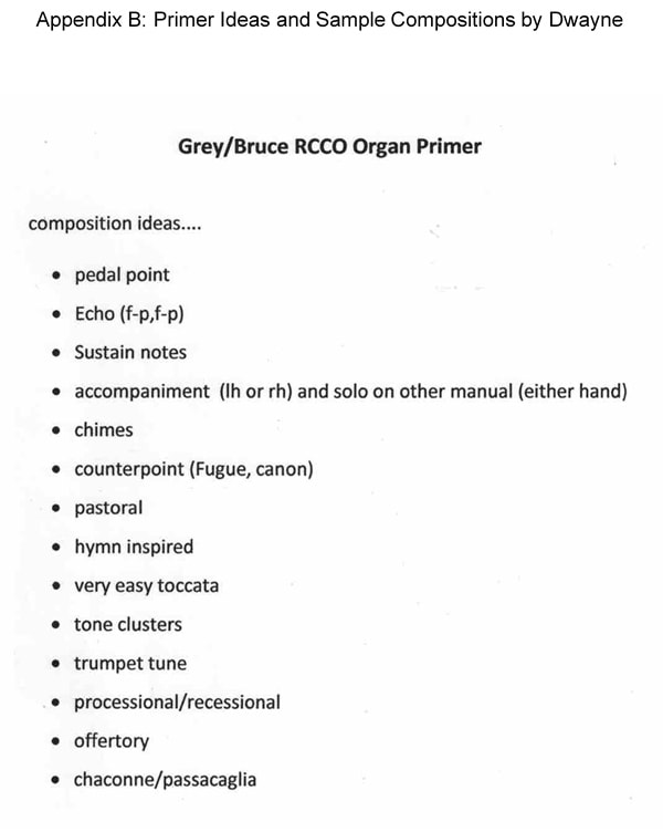 Dwayne confirmed that his company Air-O-Dynamic Duct Cleaning will cover registration fees for organ students for Walkerton Music Festival. Dwayne also sketched the idea that to encourage piano registrants to enter in organ category of the festival, GBRCCO publish an organ primer. To demonstrate some concrete idea of the primer, he distributed a printout of the ideas of types of compositions to be included and a couple of his own compositions (Appendix B).