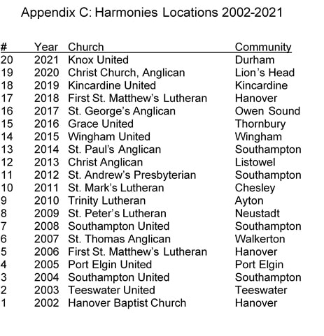 Choose a fairly large church in a community large enough to draw a good sized attendance. We might invite non-members’ churches and Amish to participate. A few possible churches were suggested as having enough space and a large enough organ: Kincardine United, Knox United, Durham, First St. Matthew’s, Hanover, Central Westside United, Owen Sound, St. Mary’s, Owen Sound. However, considering other churches may be way to include them. Chesley Lake Camp was also suggested. It was suggested that our various services (Hymn Festival, Harmonies, and Ascension Day) should be spread out geographically.